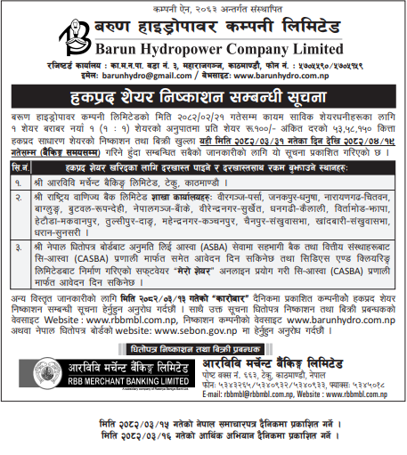 Read MoreBarun Hydropower Company Ltd. (earlier known as Barun Hydropower Development Company Pvt. Ltd) is a limited company registered under the Company Act o